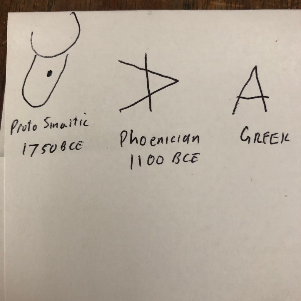 I remember looking up information on the alphabet from a set of encyclopedia’s my parents had and it had pictures of the letters used in Mesopotamia, hieroglyphics of Egypt, Greek and finally Roman letters. I was most impressed with the development of the first letter, “A.” which looked like it started off as a representation of a bull or something and then progressed into the shape the Romans and we use today. The article didn’t cover Eastern languages, which is more of a failing of the 1960s when the articles was written, but it was still a very good piece.